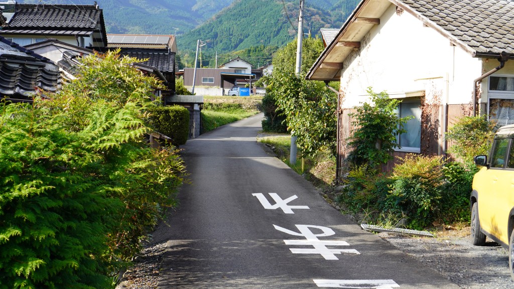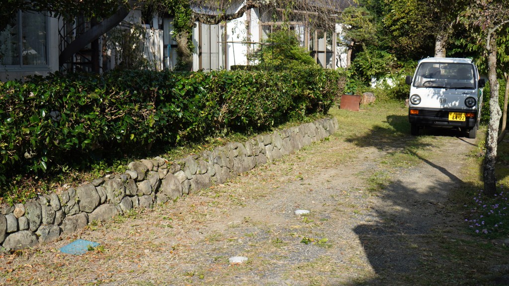 RV、ワゴン、大きめの普通車はこちらに、石像に向かって斜めに、道にはみ出さないように駐車してください。